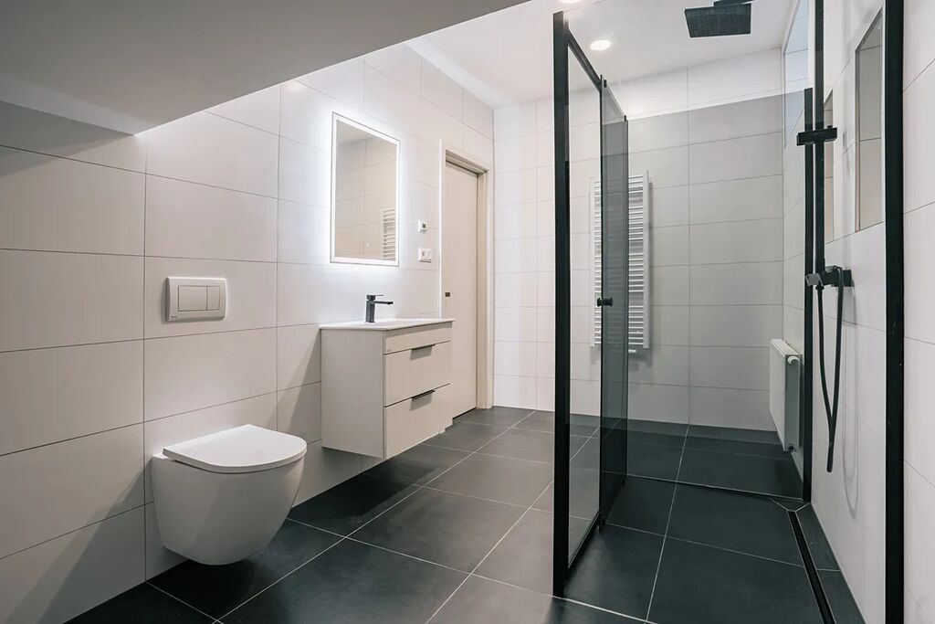 • Koupelny s černými bateriemi a podlahovým vytápěním
