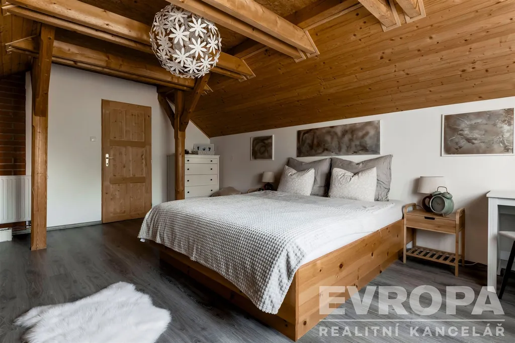 Dvoupatrová chalupa s falešným roubením o zastavěné ploše 197 m2 byla v roce 2022 od základu velmi vkusně zrekonstruována a udržovaná okrasná zahrada s krytou pergolou o ploše 274 m2 a její okolí nabízí maximální komfort.