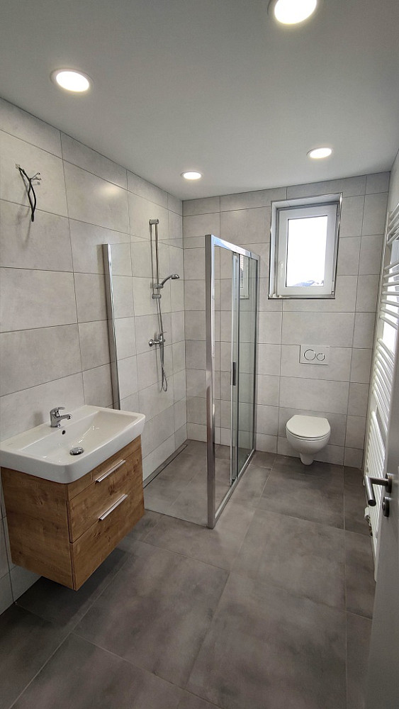 Podlahy jsou laminátové (mimo koupelnu a WC), v koupelně a na WC je keramický obklad a dlažba v matném provedení. Koupelna nabízí sprchový kout s nerezovým žlabem, přípravu pro pračku a sušičku a topný žebřík pro vyšší komfort. Závěsné WC usnadňuje údržbu.