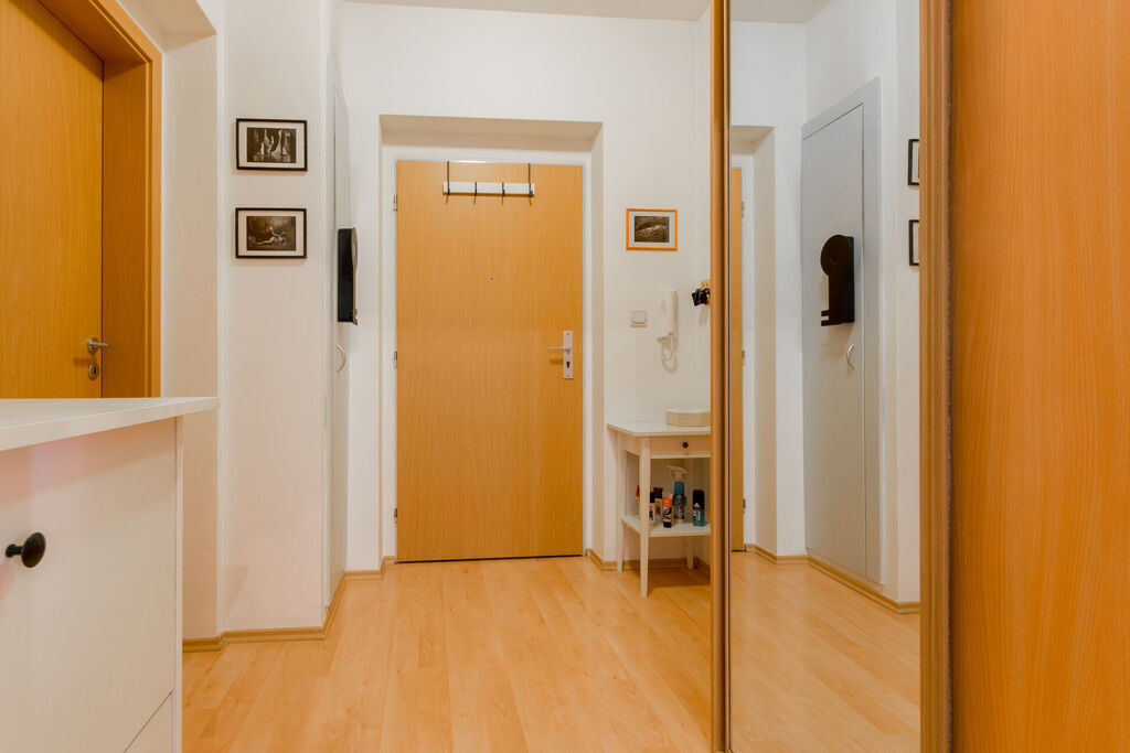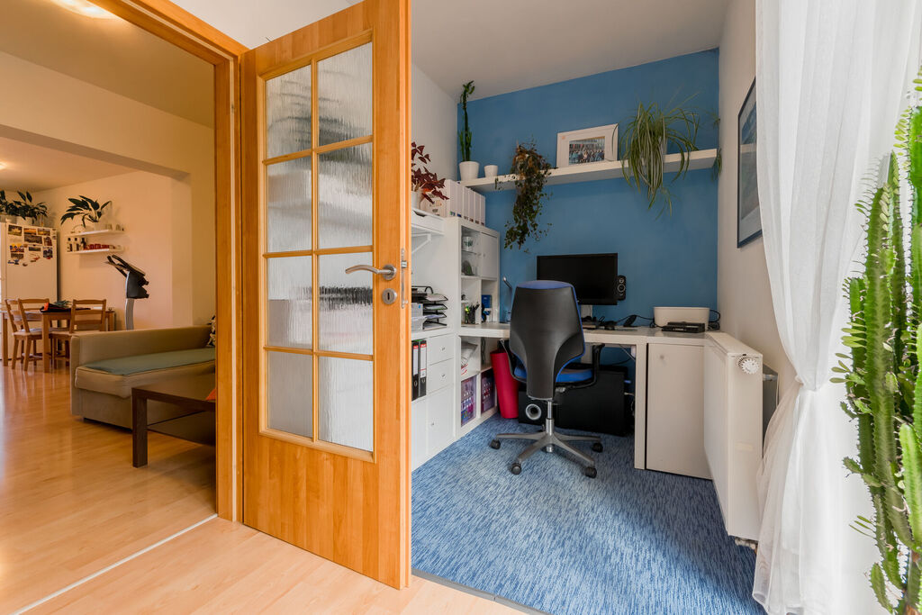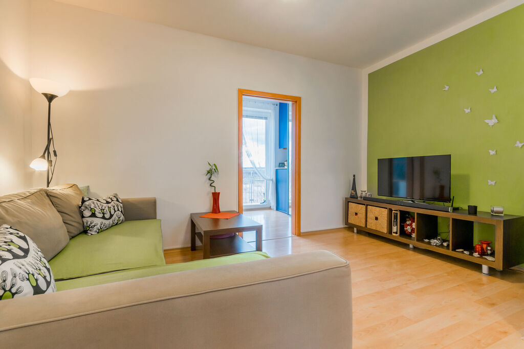Byt se skládá ze vstupní chodby, koupelny s vanou a WC. Světlé ložnice, která je orientovaná na jih. Prostorné kuchyně s na míru dělanou kuchyňskou linkou. Kuchyň je dobře osvětlena a vybavena: sporákem se sklokeramickou deskou, horkovzdušnou troubu, digestoří, myčkou. Z kuchyně je možný vstup na balkón. Obývací pokoj je spojen s kuchyní a jídelním koutem. Z obývacího pokoje je vstup do menšího dětského pokojíčku nebo pracovny, ze které je vstup na balkón, z něhož je krásný výhled do krajiny.