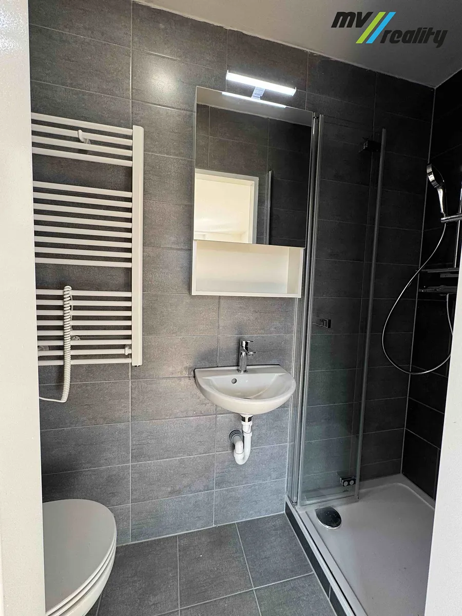 Koupelna je moderně řešená, obložena elegantními šedými dlaždicemi. Je vybavena sprchovým koutem se skleněnou zástěnou, závěsnou toaletou, umyvadlem se skříňkou, zrcadlem a topným žebříkem, který lze mimo topnou sezónu zapojit i do elektřiny.