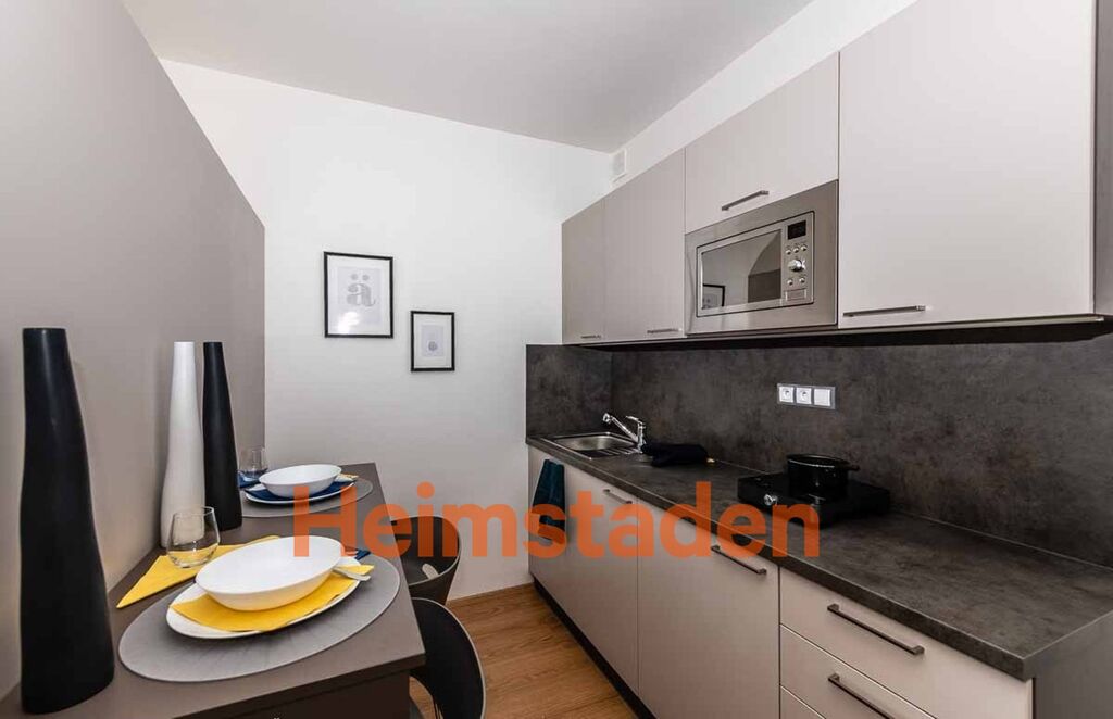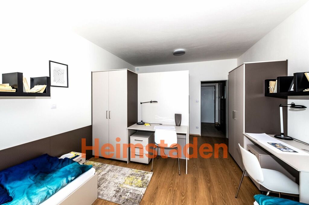 Byt je kompletně zařízený a připravený k okamžitému nastěhování. Dominantou světlé obytné části jsou dvě jednolůžkové postele, které lze snadno spojit do prostorného dvoulůžka. Kuchyňský kout je elegantně řešený a maximálně funkční – k dispozici je menší vestavná lednice, mikrovlnná trouba a praktický vařič, což z něj dělá ideální řešení pro ty, kdo preferují snadnou údržbu a efektivní využití prostoru. Koupelna je vybavena sprchovým koutem, umyvadlem a toaletou. Celý byt působí svěže, útulně a díky neutrálním tónům interiéru umožňuje novým nájemníkům dotvořit si prostor podle vlastního stylu.