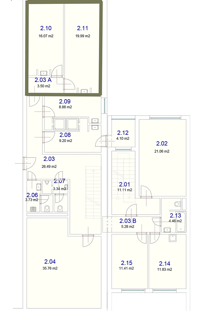 • Vstup přes vlastní předsíňku (3,5 m²), která navazuje na dvě samostatné kanceláře ( 20 m² a16 m²)