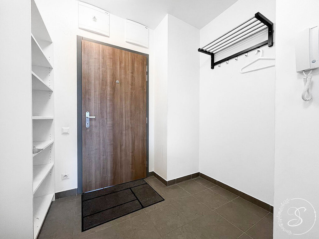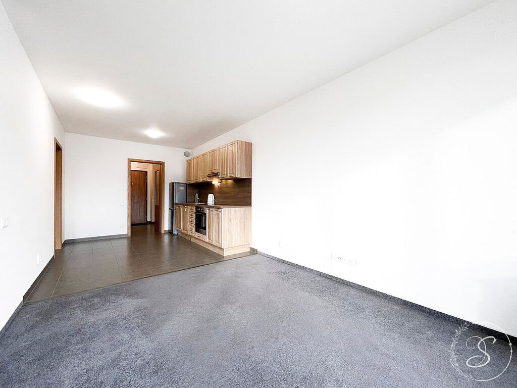Byt bude zařízený. Zahrnuje jeden samostatný neprůchozí pokoj a obývací pokoj s kuchyňskou linkou, která je vybavena spotřebiči (vestavná trouba, sklokeramická indukční deska, lednice a myčka na nádobí). V koupelně je sprchový kout a WC.