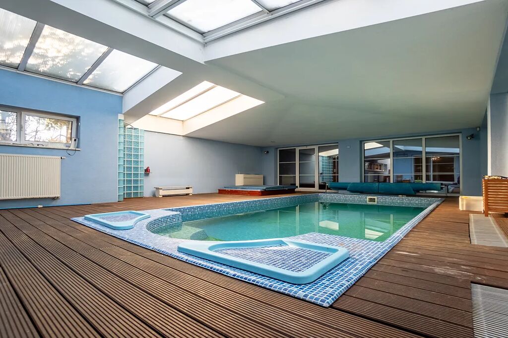 Nabízená nemovitost je samostatně stojící objekt rodinného domu, podsklepený, s jedním nadzemním podlažím a podkrovím. Je zděný, střecha je sklonitá s krytinou z betonové tašky, bleskosvod je instalován, klempířské prvky jsou z měděného a pozinkovaného plechu. Fasáda je zakázková, drásaná. Okna jsou plastová, vnitřní dveře jsou plné a prosklené, do obložkových zárubní, podlahy jsou z dlažby, koberců a laminátu. WC jsou splachovací, koupelny s vanami, sprchové kouty, umyvadla. Vybavení kuchyně je s linkou, varná deska, spotřebiče, Mezi další vybavení domu patří: klimatizace, pohybový alarm, vestavěné skříně, krb, digestoř, sauna, whirpool, bazén vnitřní, ochlazovací bazén, tepelné čerpadlo. V domě je zavedena elektřina o napětí 230V a 400V a je napojen na rozvodnou síť elektrického proudu. Zdrojem vody je vodovod, má připojení na veřejnou kanalizaci a rozvod zemního plynu je připojen. Řešení vytápění v domě: plynový kotel, tepelné čerpadlo země-voda (zemní vrty) a topná tělesa tvoří závěsné radiátory. V domě je instalováno tepelné čerpadlo na ohřev vody. Schody jsou betonové s povrchem z laminátu.