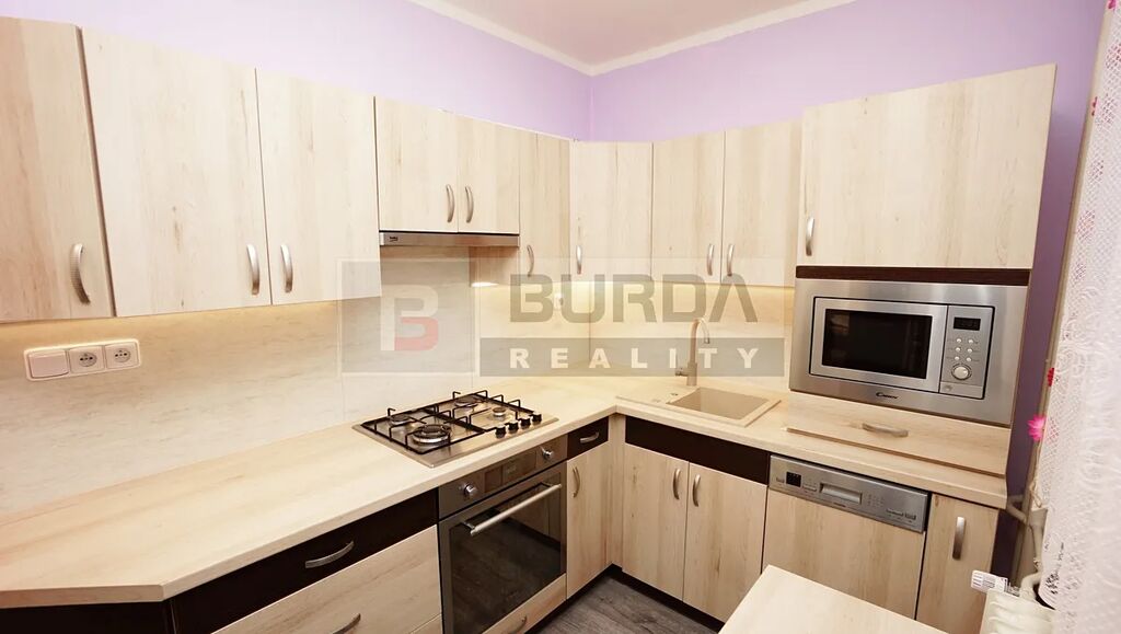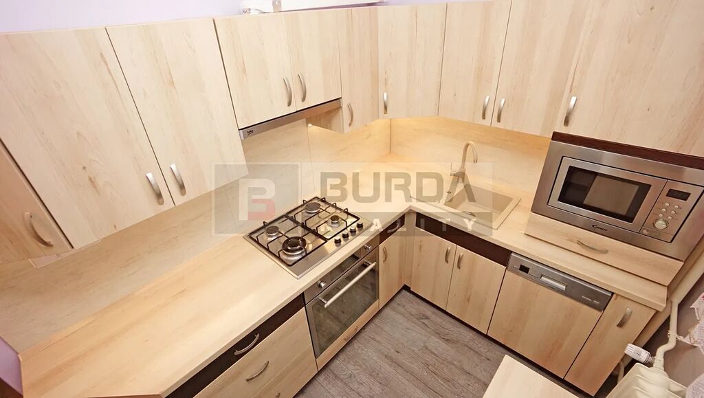 Kuchyňská linka je nová od truhláře na míru s vestavěnými spotřebiči: mikrovlnka Candy, myčka Mora š. 45 cm, el. trouba Candy, nerezová plynová varná deska, granitový béžový dřez, digestoř Beko, volně vsazená lednice Beko (zůstane). Jídelní stůl je vestavěný napevno. Vedle lednice je spížní skříň. Horní skříňky kuch. linky jsou podsvícené LED páskem. V kuchyni je sádrokartonový podhled s LED bodovkami.