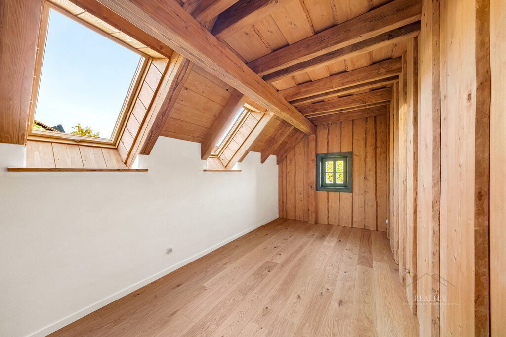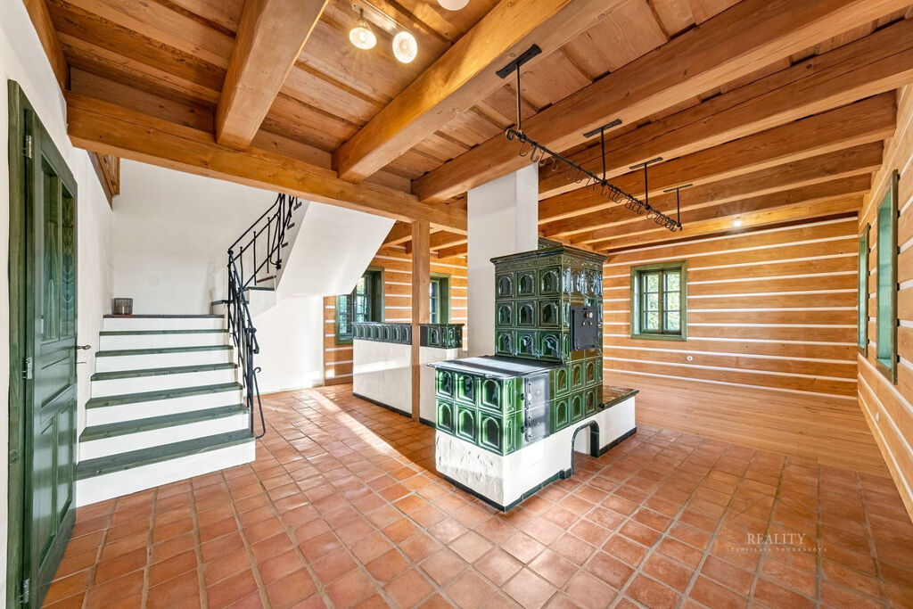 Ruční trámové prvky • kachlová kamna s ležením (6 kW) • tepelné čerpadlo NIBE S735-7 s rekuperací • dokončeno
