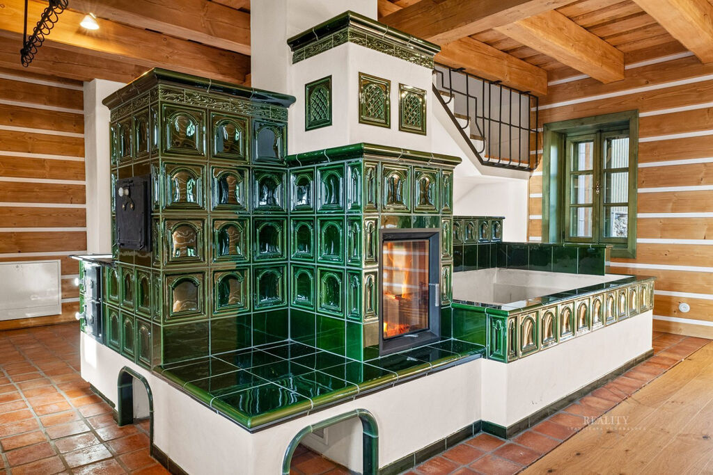 Přízemí (88,67 m²): zádveří, technická místnost, koupelna, šatna, spíž, kuchyň s jídelnou a obývací pokoj – dominuje luxusní kachlová kamna s ležením (6 kW).