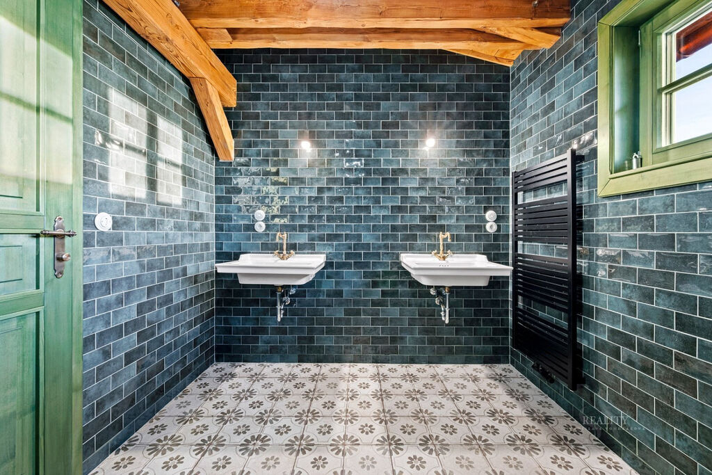 Interiér je promyšlen do posledního detailu – masivní dřevo, ručně malované obklady a precizní kovářská práce tvoří nadčasový celek. Kuchyň na míru a společenská zóna s kamny jsou srdcem domu: krásné na pohled, funkční v každodenním provozu.
