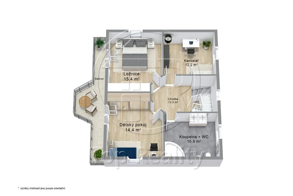 V patře jsou tři samostatné pokoje, z nichž dva mají vstup na balkon, a druhá koupelna.