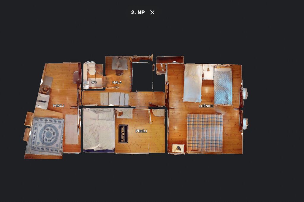 V patře jsou pak tři samostatné ložnice a toaleta. Pro skladování potravin slouží sklep (7m2) se vstupem ze zahrady a schodištěm navazuje velká garáž, která byla vybudována spolu s novým štítem domu cca před 20lety. Garáž má cca 40m2 a sloužila jako dílna s truhlárnou (s případným vyklizením se po dohodě počítá).