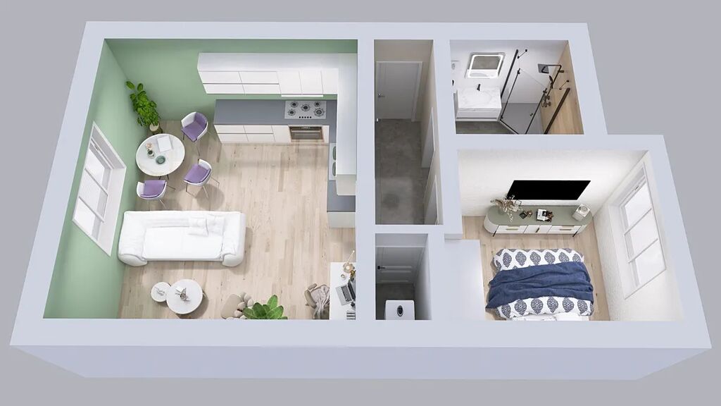 Dispozice: vstupní chodba, technická místnost s přípravou pro pračku, koupelna se sprchovým koutem a WC, ložnice a obývací pokoj s kuchyňským koutem.
