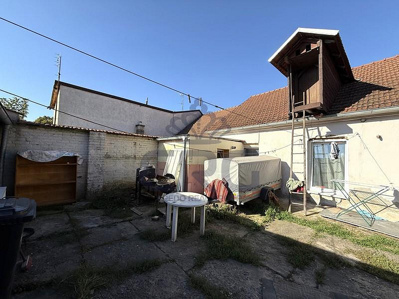 Vraty vejdeme do budovy, kde je průjezd až na pozemek. Samotný vjezd má celkovou plochu cca 21,76 m². Z vjezdu je vstup do dvou samostatných bytových jednotek, každá se nachází na jiné straně budovy. Dále pokračujeme do dvoru, kde se nachází nespočet zastřešených prostor včetně garáže, kůlny a spousty dalších místností. Projdeme jednou z částí těchto prostor a ocitneme se na příjemné zahrádce, která svým obyvatelům může poskytnout prostor pro pěstování zeleniny, ale i klid a relaxaci, kterou si každý nás zaslouží. Celková plocha zahrady je 96 m², z toho délka je cca 15 metrů a šířka 6,4 metrů. Na dvoře se nachází sklep s klenutým stropem, který přímo vybízí k vybudování vinného sklípku.