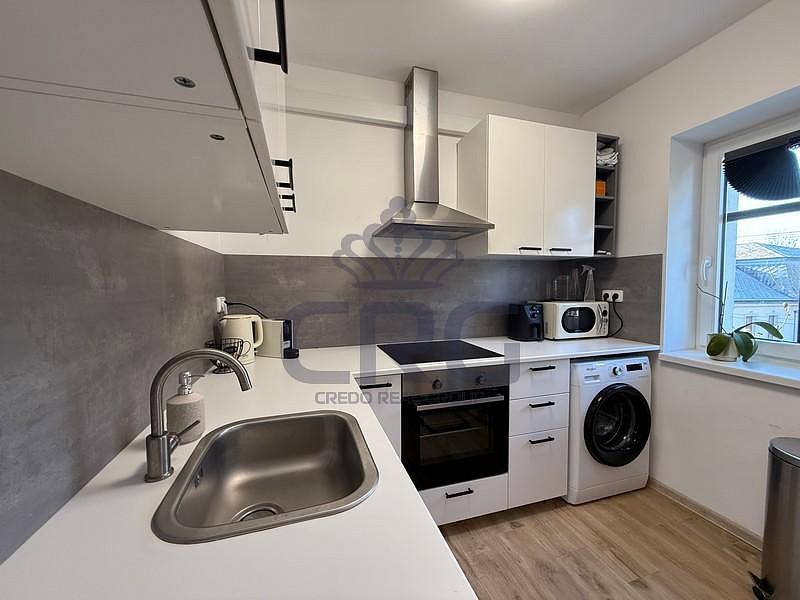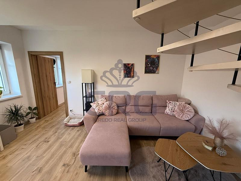 Za vchodovými dveřmi se ocitneme v prostorné chodbě (cca 3,14 m²), ze které je vstup do velké koupelny (cca 2,65 m²). Koupelna s WC je vybavena umyvadlovou skříňkou, umyvadlem, velkým zrcadlem, WC a sprchovým koutem. Hlavní dominantou bytu je pokoj s kuchyňským koutem (cca 24,10 m²), který disponuje novou kuchyňskou linkou, jejíž součástí je digestoř, elektrická trouba, elektrická sklo-keramická deska a pračka. Lednička s mrazákem zde není, ale majitel v případě zájmu lednicí s mrazákem byt dovybaví. V tomto pokoji je také široké točité schodiště vedoucí do mezonetu, kde je pokoj (galerie) o výměře (cca 21,39 m²) s přiznanými trámy a střešním oknem. V místnosti je klimatizace značky LG, která chladí i vytápí. V přízemí nesmíme opomenout ani další samostatný pokoj (cca 13,21 m²), který může sloužit jako obývací, ale i jako ložnice.