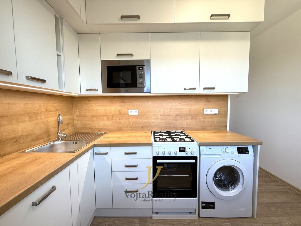 Byt je vybaven novou kuchyňskou linkou na míru, vestavěnými skříněmi, lednicí s mrazákem, myčkou, pračkou se sušičkou, mikrovlnnou troubou, elektrickou troubou a plynovým sporákem. Kuchyně je vybavena také nádobím.