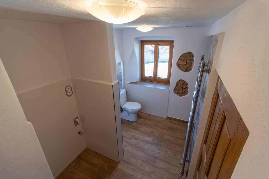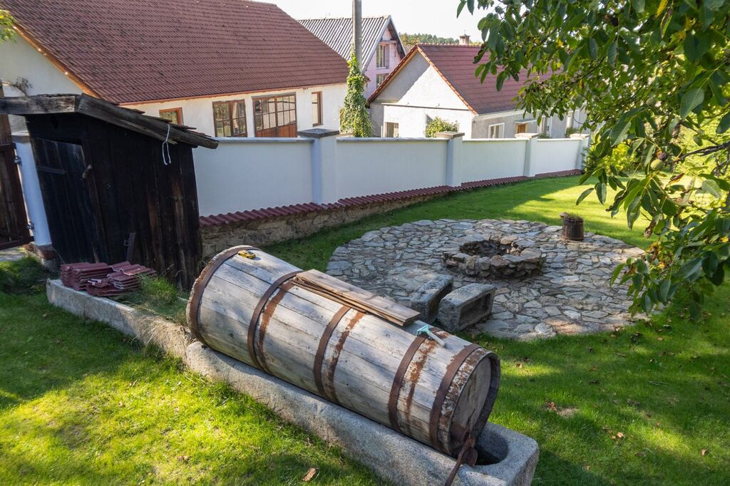 Dispoziční řešení: 4+1 o zast. ploše domu cca 180 m2, s celkovou obytnou pl. cca 100m2, o celkové ploše pozemku 1.155m2. Vnitřní dispozice: vstupní předsíň s chodbou a funkční udírnou, kuchyně s funkční pecí, el. sporákem s vestavěnými spotřebiči v nové kuchyňské lince, prostorný obývací pokoj + další tři pokoje; koupelna se sprchovým koutem, topným žebříkem, WC. Na dům navazují dva prostory s klenbovými stropy a komínem, vhodné k vytvoření příjemného společenského posezení, či vinárny. Prostory lze sloučit. Dřevěné masivní posezení je k dispozici. Součástí nemovitosti je velmi prostorná stodola (140 m2) s vlastním sklepem. Do stodoly je přívedena voda a odpady, na podlaze je leštěný beton. Dále pak nádherný zemní sklípek (10m2). Pozemek je obestavěn zdí v kombinaci osázenými stromky, které zajišťují naprosté soukromí nemovitosti se sluncem po celý den.