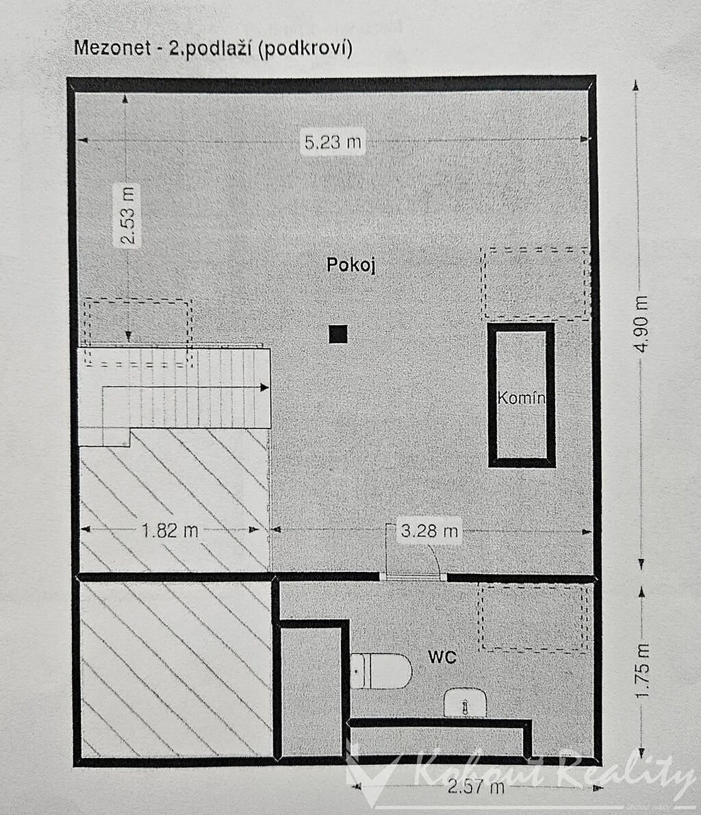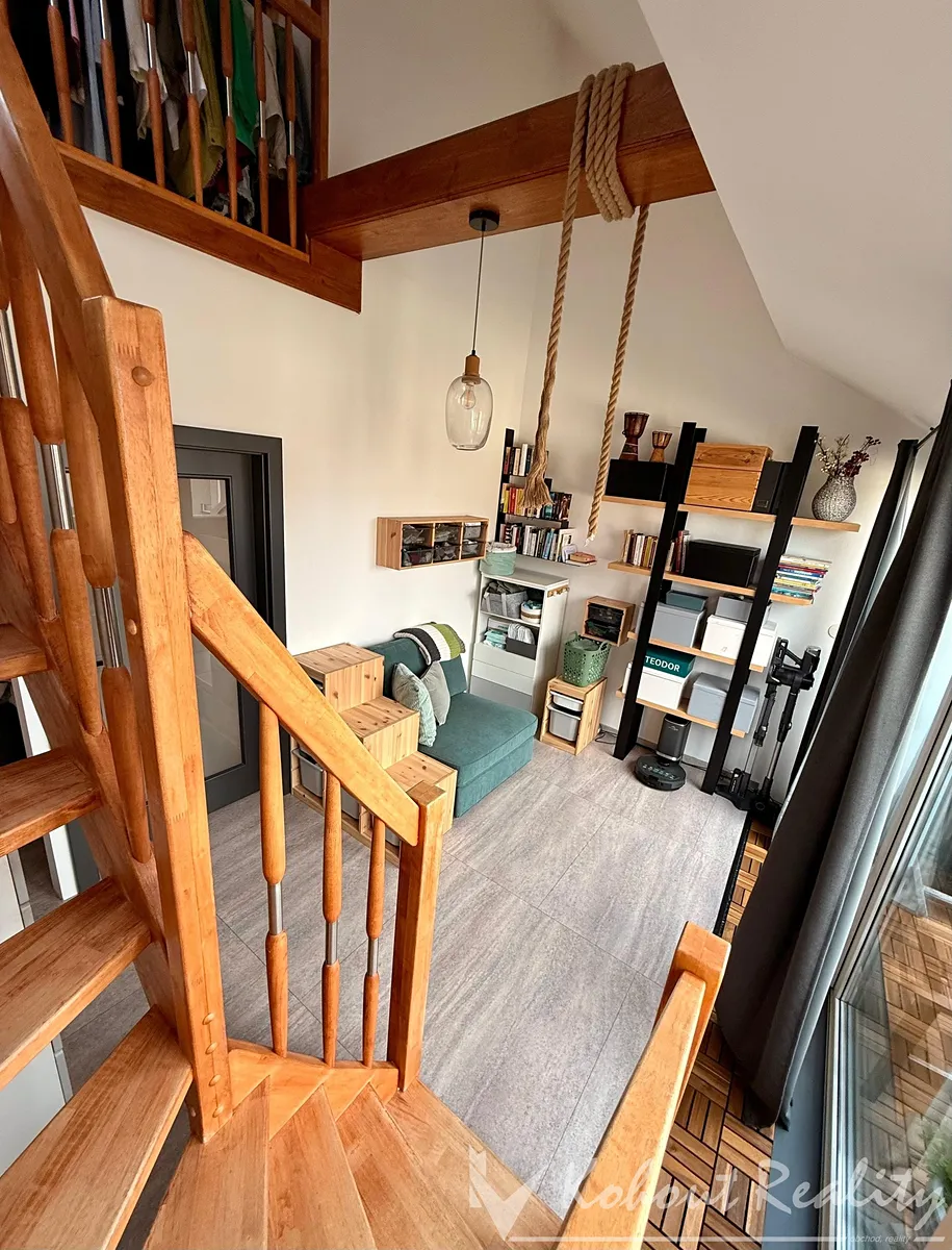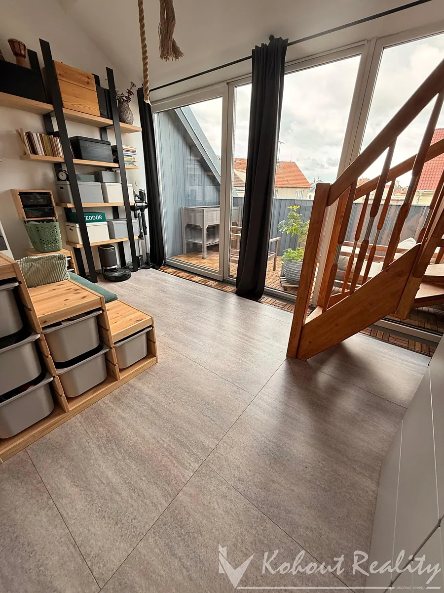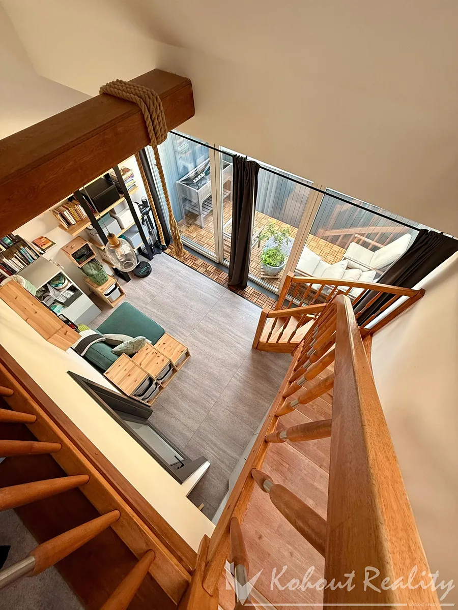 Byt je řešen jako mezonet. V přízemí se nachází prostorný obývací pokoj s masivní dubovou kuchyňskou linkou a lakovanou bukovou pracovní deskou, indukčním sporákem dále jídelní část, hala, samostatné WC a koupelna.Součástí přízemí je také otevřený pokoj s přímým vstupem na terasu, z něhož vede dřevěné schodiště do horního patra. Tento pokoj lze uzavřít posuvnou příčkou, dekoračním závěsem a využít ho například jako pracovnu, studovnu nebo rohový pokoj pro návštěvy (přiloženo více fotografií z různých úhlů pro Vaší představu). V 1. patře se nachází ložnice, koupelna s WC a velké množství úložných prostor. Byt má dvě koupelny, nové rozvody vody a odpadů, vodní podlahové topení, vinylové podlahy, klimatizaci s rekuperací a výměníkem.