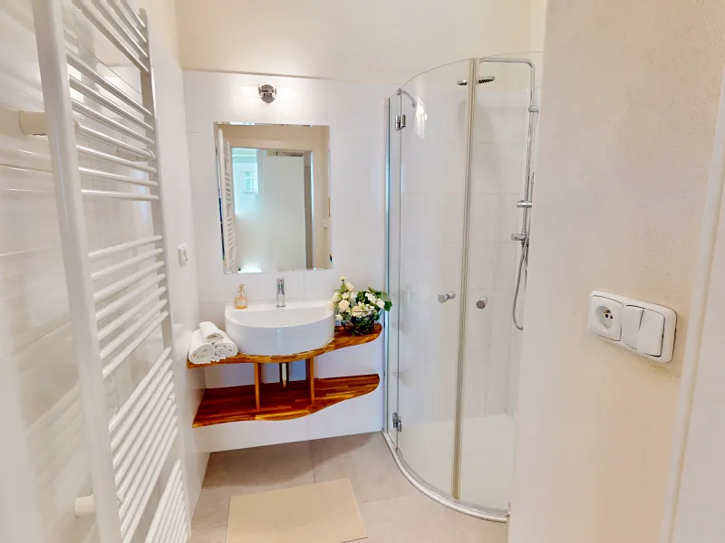 Kuchyň s oknem je umístěna v prostorné předsíni, což dodává bytu vzdušnost a praktické uspořádání. Dále je zde koupelna se sprchovým koutem a samostatná toaleta, kde je dostatek místa pro pračka a úložné police.