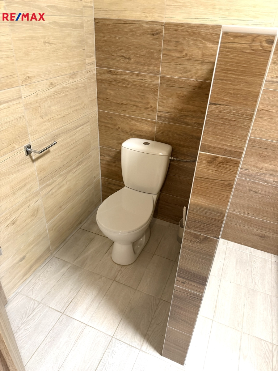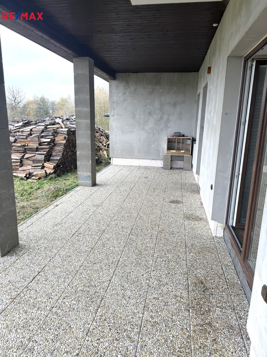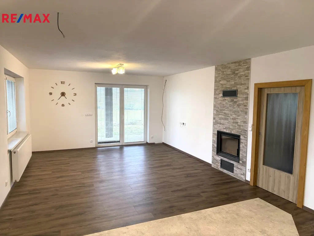 V levé části domu je obývací pokoj se vstupem francouzskými okny na terasu, kuchyňská linka včetně spotřebičů, komora, koupelna s WC, technická místnost.