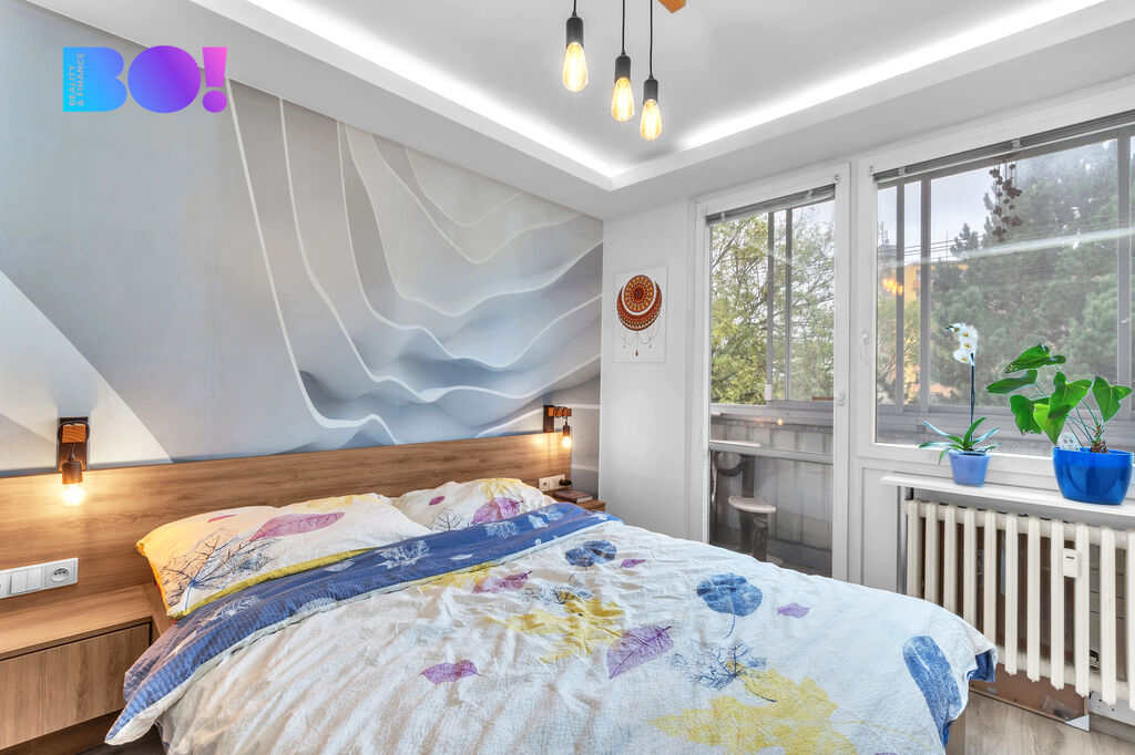 Dispozice: vstupní chodba, dětský pokoj, koupelna se sprchovým koutem a WC, kuchyň s jídelní a obývací částí, ložnice se vstupem na zasklený balkon.