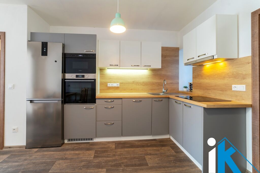 V přízemí se nachází nová kuchyňská linka se spotřebiči Whirlpool a podlahovým vytápěním, dále obývací pokoj s krbem s plněním z průjezdu, který dodává domovu příjemnou atmosféru.