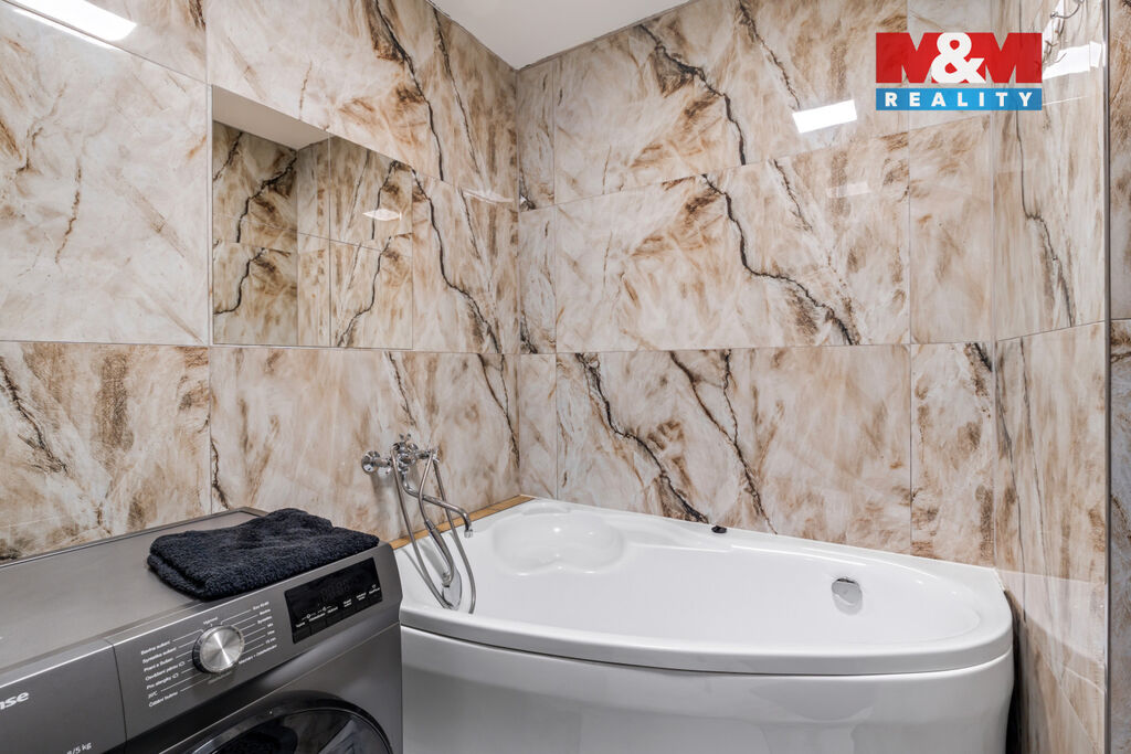 Zděná koupelna s rohovou vanou, umyvadlem a toaletou, je po celkové rekonstrukci ,včetně rozvodů.