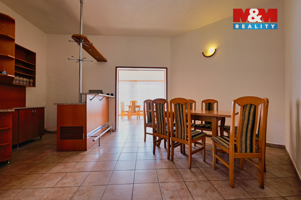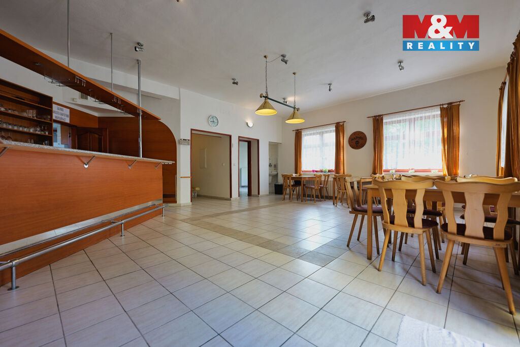 1. nadzemní podlaží – komerční část (12 místností): větší sál s kapacitou 25–35 osob, bar a kompletně vybavená nerezová kuchyně, ideální pro hospůdku, svatby či oslavy a přímý vstup na dvorek. Druhý sál pro 35–40 osob s menším barem, dále několik úložných prostor, sociální zázemí (WC, sprcha, umyvadla).