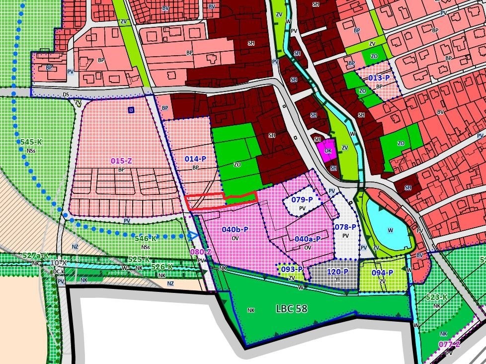 Pozemek je dle územního plánu obce určen na BP - bydlení příměstské s hlavním využitím bydlení v rodinných domech - zastavěná plocha stavebního pozemku hlavní stavbou se omezuje na maximálně 250 m², zástavba s max. 2 nadzemními podlažími + podkrovím, max. výška zástavby 11 m; část pozemku cca 1165 m² je určena pro zástavbu a část cca 568 m² na zahradu.