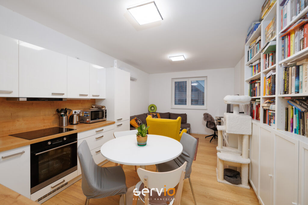Vybavení bytu: Kuchyňská linka včetně zabudovaných spotřebičů (sklokeramická deska, el. trouba, lednice, myčka), klimatizace. Vytápění zajišťuje plynový kotel. Možnost parkování před domem.