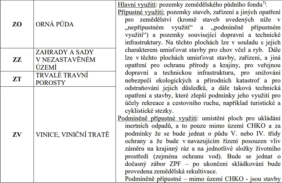 Přípustné využití: pozemky staveb, zařízení a jiných opatření pro zemědělství (kromě staveb uvedených níže v „nepřípustném využití“ a „podmíněně přípustném využití“) a pozemky související dopravní a technické infrastruktury. Na těchto plochách lze v souladu s jejich charakterem umisťovat stavby pro chov včel a ryb. Dále lze v těchto plochách umisťovat stavby, zařízení, a jiná opatření pro ochranu přírody a krajiny, pro veřejnou dopravní a technickou infrastrukturu, pro snižování nebezpečí ekologických a přírodních katastrof a pro odstraňování jejich důsledků, a dále taková technická opatření a stavby, které zlepší podmínky jeho využití pro účely rekreace a cestovního ruchu, například turistické a cyklistické stezky