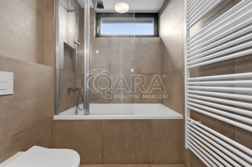 Ložnice je vybavena manželskou postelí a skříněmi. Koupelna nabízí vanu, umyvadlo, toaletu a úložné prostory v podobě skřinky nad a pod umyvadlem, vstupní chodba pak disponuje vestavěnými skříněmi s podsvícením a prostornou komorou s přípojkou na pračku se sušičkou. Veškeré vybavení z fotografií je součástí tohoto dlouhodobého pronájmu.