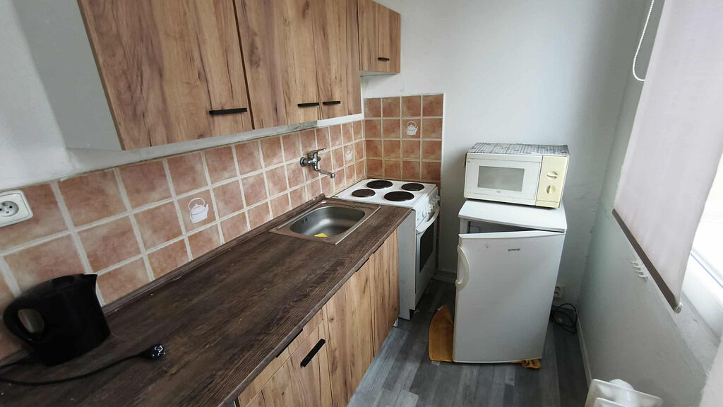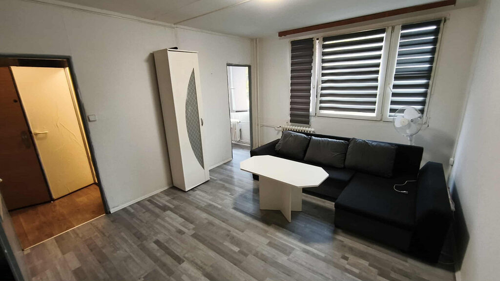 Dispozice bytu zahrnuje obývací pokoj a kuchyň , koupelnu a WC. Byt je částečně vybaven rozkládací sedací soupravou , stolkem , pračkou a ledničkou, byt je čistý, udržovaný a vhodný k okamžitému bydlení – ideální pro jednotlivce nebo pár.