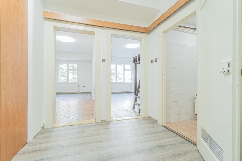 Dispozice bytu zahrnuje prostornou předsíň s dostatkem místa pro úložné prostory, samostatnou koupelnu a WC, kuchyň s prostorem pro jídelní stůl či obývací část a další pokoj, který lze využít jako ložnici s pracovnou.