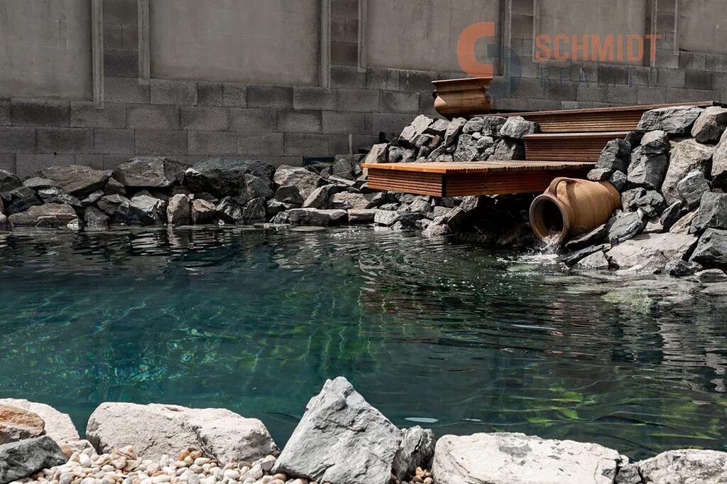 Jižní strana má elektrické předokenní žaluzie – chlad, stín, soukromí. Zahrada je akorát velká: přírodní koupací jezírko, zapuštěné kamenné ohniště, místo pro posezení. Ráno vychází slunce nad hrází, občas zavítají srnky. Pozemek je orientovaný od silnice do přírody – skutečný klid.