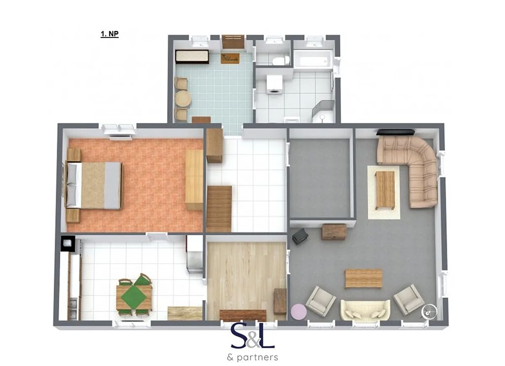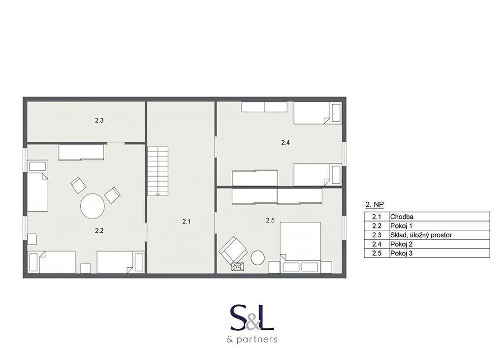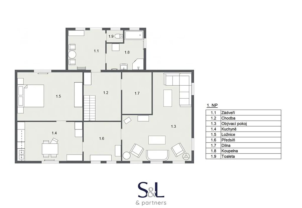 Jedná se o dvoupodlažní dům s celkovou užitnou plochou cca 195 m2, který disponuje čtyřmi ložnicemi, kuchyní a prostorným obývacím pokojem. Dále zde nalezneme koupelnu vybavenou sprchovým koutem i vanou, samostatnou toaletu, dílnu a půdní prostor.