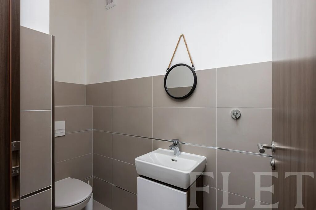 Při vstupu do bytu vás uvítá prostorná chodba, odkud se dostanete do všech pokojů. Světlý obývací pokoj je propojen s moderním kuchyňským koutem, který nabízí všechny nezbytné spotřebiče a dostatek úložného prostoru. Součástí je i jídelní část s jídelním stolem a židlemi. Zbylé tři pokoje můžete využít např. jako ložnici, pracovnu a dětský pokoj. V jednom z pokojů je velká vestavěná šatní skříň, v druhém vás nadchne soukromá toaleta. V druhé koupelně si budete moci užívat relax ve vaně a jistě vás potěší přítomnost pračky a sušičky. Posledními místnostmi jsou oddělená toaleta a praktická komora. Velkou předností bytu je hezká rohová terasa s venkovním nábytkem a s výhledem do klidné zástavby. Jak již bylo zmíněno, s parkováním si starosti dělat nemusíte, k bytu náleží garážové stání přímo v domě.
