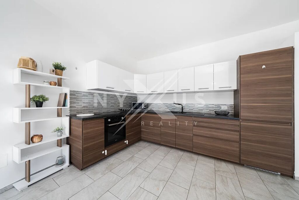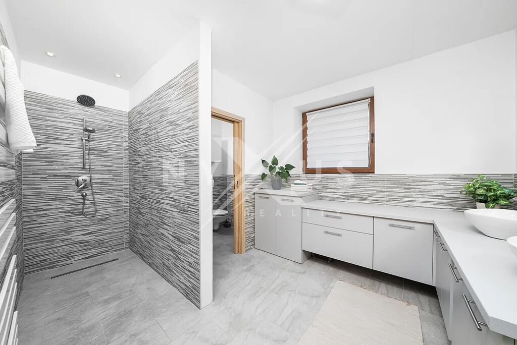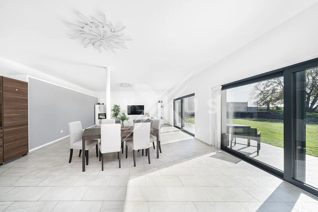Už při vstupu zaujme velký a světlý obývací pokoj, který přirozeně navazuje na terasu a zahradu. Je to místo, kde se budete rádi scházet s rodinou i přáteli, ať už v zimě u krbu, nebo v létě s otevřenými dveřmi na terasu. Kuchyň s jídelní částí tvoří přirozené centrum celého domu a poskytuje dostatek prostoru pro každodenní vaření i společné večeře.
