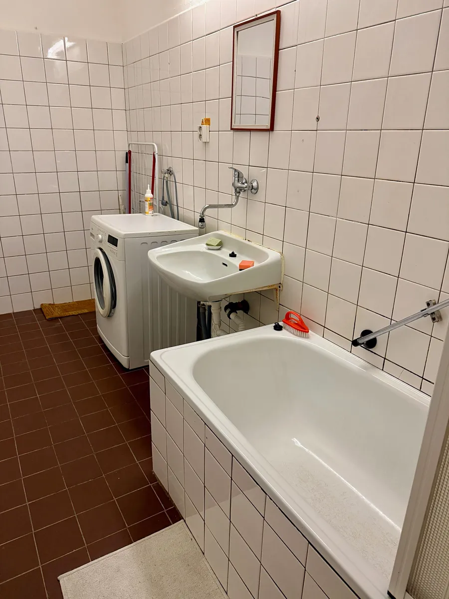Byt má samostatnou kuchyni s jídelním stolem, průchozí obývací pokoj, ložnici, koupenu s vanou a pračkou, a samostatnou toaletu.