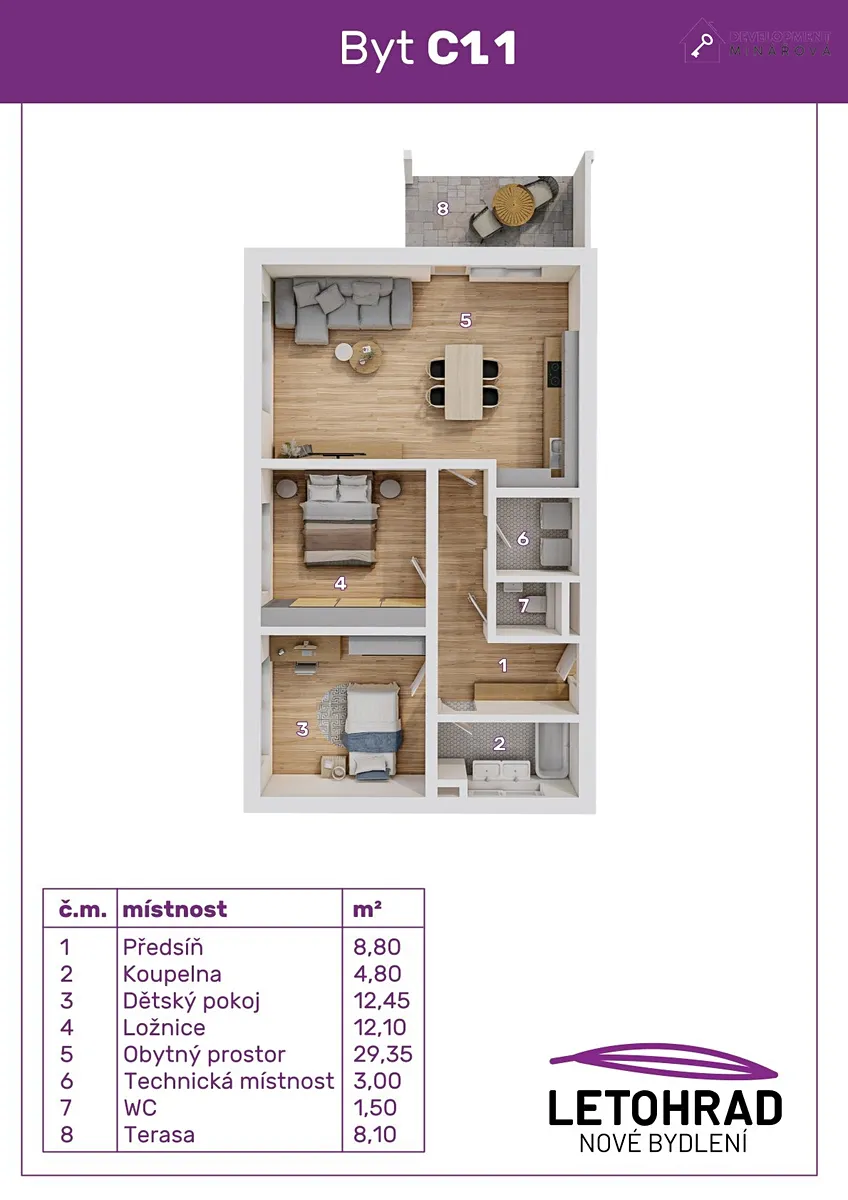 - Dispozice 3+kk – užitná plocha 72,20 m² - obývací pokoj spojen s kuchyní, 2 pokoje, koupelna, technická místnost/šatna a samostatné wc