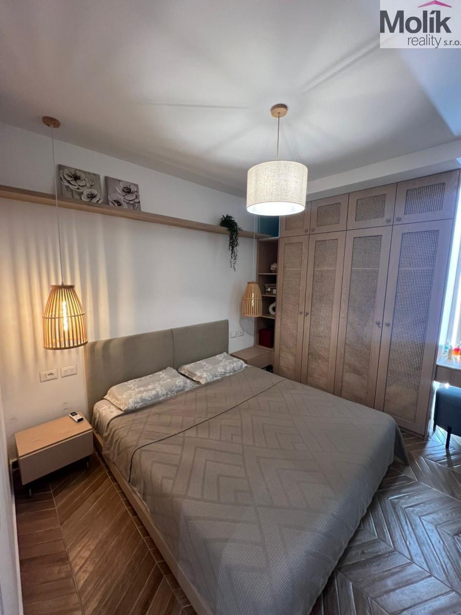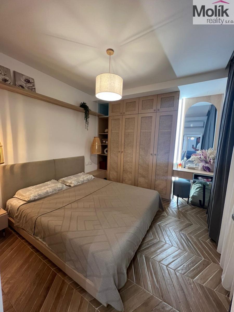 Ložnice: útulná a harmonicky zařízená s manželskou postelí, nočními stolky a vestavěnou šatní skříní s dekorativními ratanovými výplněmi. Teplé světlo z designových lamp vytváří příjemnou atmosféru.