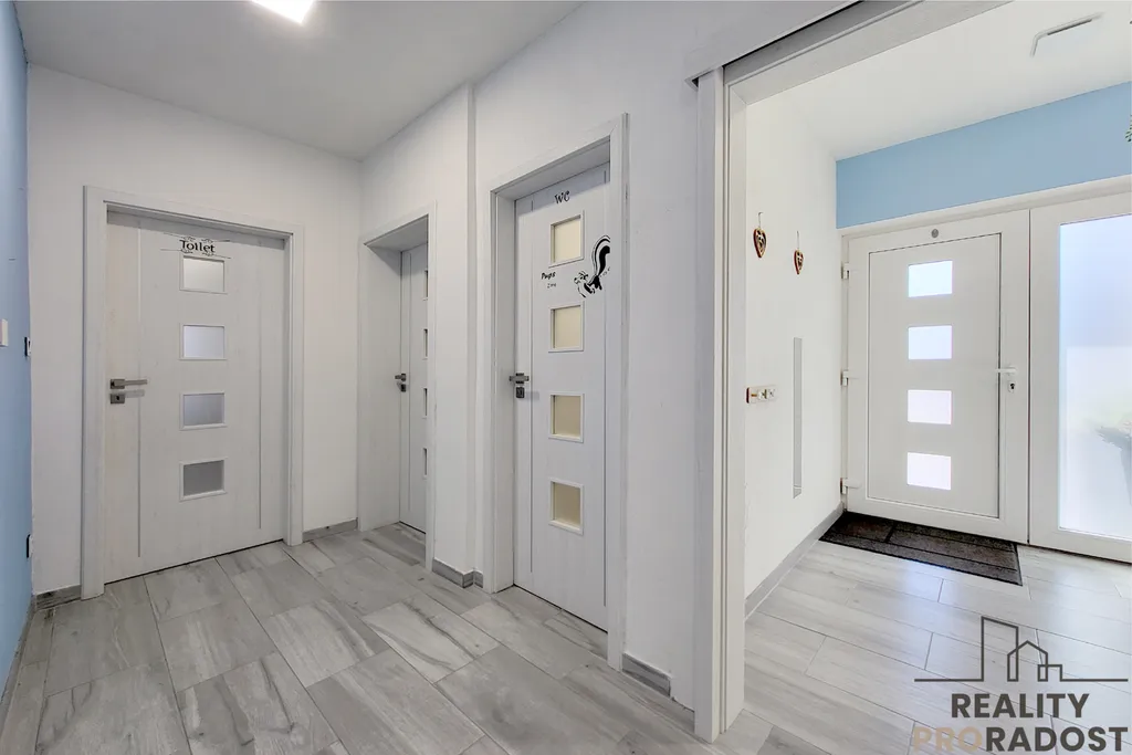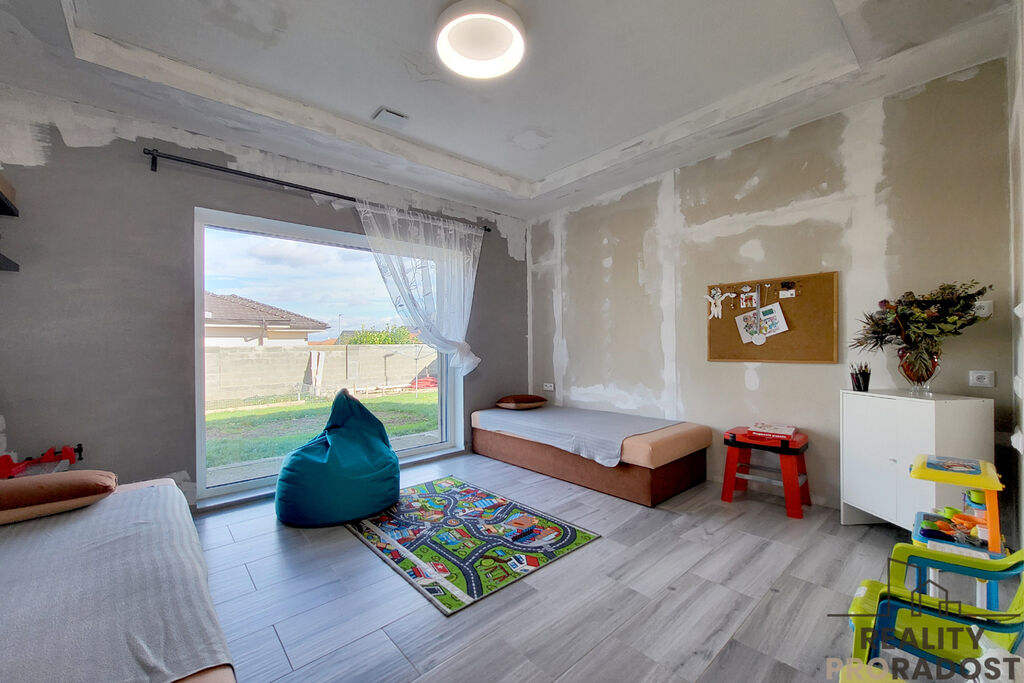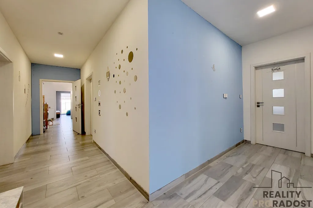 Dispozice domu je velmi praktická – pět pokojů, samostatná kuchyně, spíž, technická místnost a šatna. K domu náleží také zastřešená terasa (nedokončená), která po dokončení nabídne ideální prostor pro rodinné posezení a odpočinek.