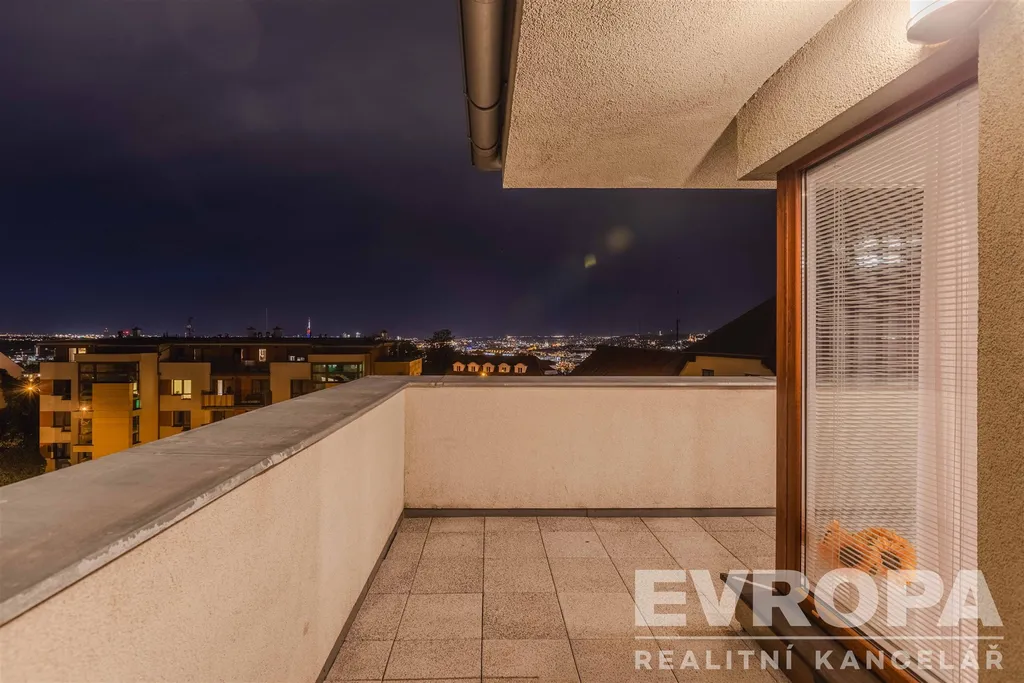 Terasa obklopuje celý byt a poskytuje panoramatický výhled na Prahu – ideální místo pro relaxaci, posezení s přáteli nebo klidné večery s výhledem na město.