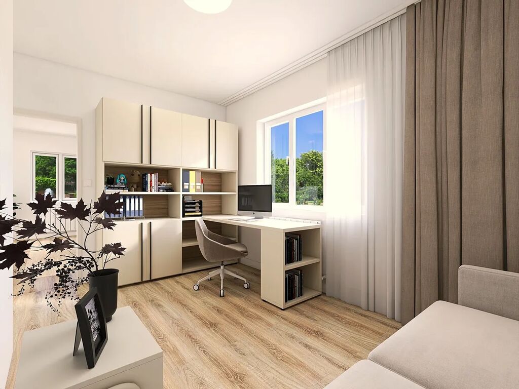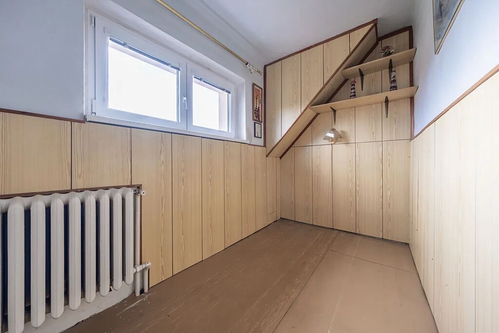 V horním patře je druhá jednotka: obývací pokoj s kuchyňským koutem, ložnice se šatnou, menší pokoj a koupelna s WC. Dispozice se domu se dá ale předělat k potřebám každého a je možné z něj tak vybudovat nový domov pro jednu rodinu.