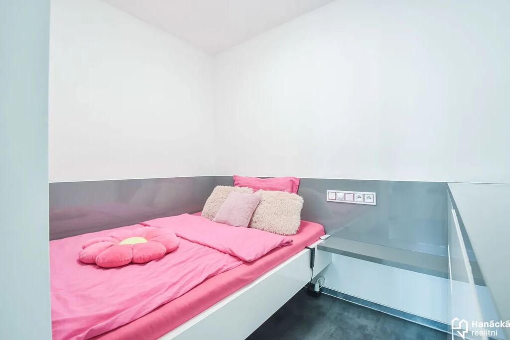 Byt je moderně a vkusně vybavený, postel je šikovně oddělená od obytné části, takže tu máte dostatek soukromí i prostor pro relax i práci.