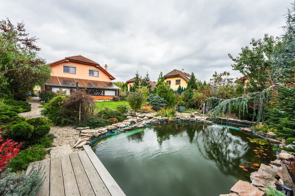 Zahrada potěší každého, kdo má rád klid a přírodu. Najdete zde jezírko o hloubce 1,6 m s přírodním čištěním vody, rozvody užitkové a dešťové vody, a dostatek prostoru pro odpočinek i praktické využití.
