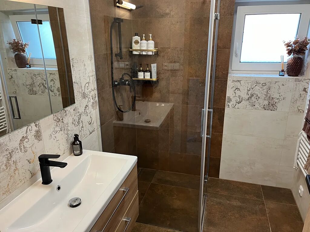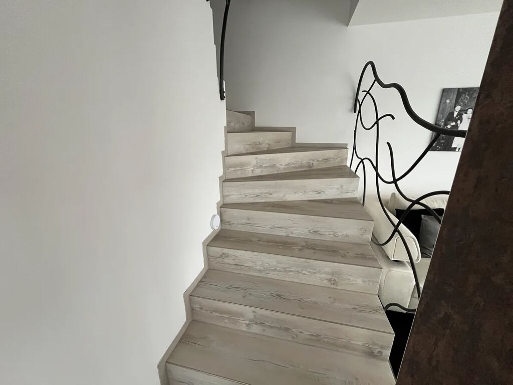 Dispozičně: V přízemí vstupní zádveří, prostorný pokoj s kuchyňským koutem a ostrůvkem, s vestavěnými spotřebiči BOSCH včetně myčky, 2x francouzské dveře do dvora a do zahrady, úložná komora řešena v prostoru pod schodištěm, samostatné WC, technická místnost s kotlem, pračkou a sušičkou. Dále do patra: schodiště s originálním tmavým zábradlím od kováře. V patře: celkem 3 neprůchozí pokoje, ložnice se vstupem na balkon 5 m2 a s vlastní šatnou, orientováno na východ, na druhé straně menší chodby 2 dětské neprůchozí pokoje ( nebo pokoj a pracovna) orientovány na západ ven s vyhlídkou ven z obce, koupelna se sprchovým koutem. Sklopný žebřík na půdní prostor.