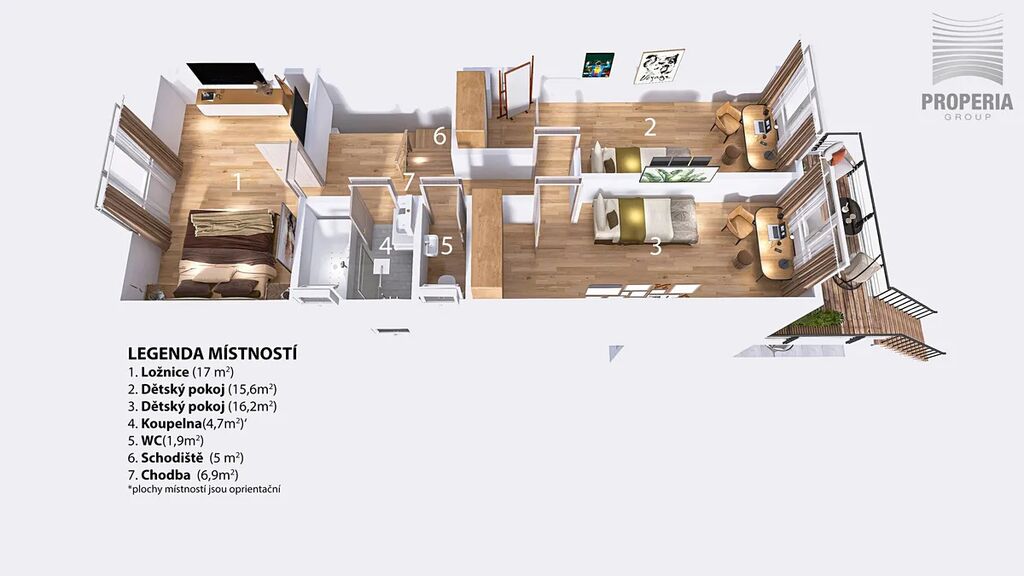 •	Tři ložnice (hlavní ložnice + 2 dětské pokoje)