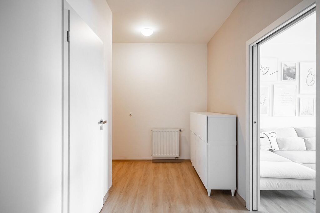 Byt se nachází ve 4. patře novostavby z roku 2010, k dispozici je výtah.  Sklep a parkovací stání je součástí pronájmu. Byt je vytápěn dálkovým vytápěním, ale také klimatizací (ta chladí i topí).