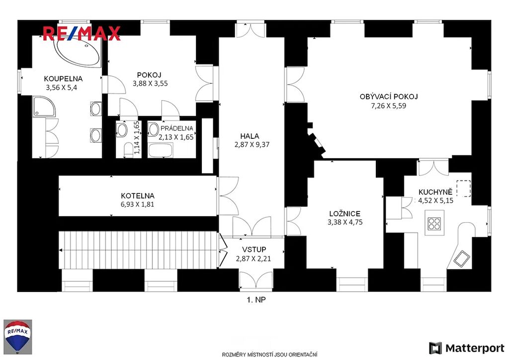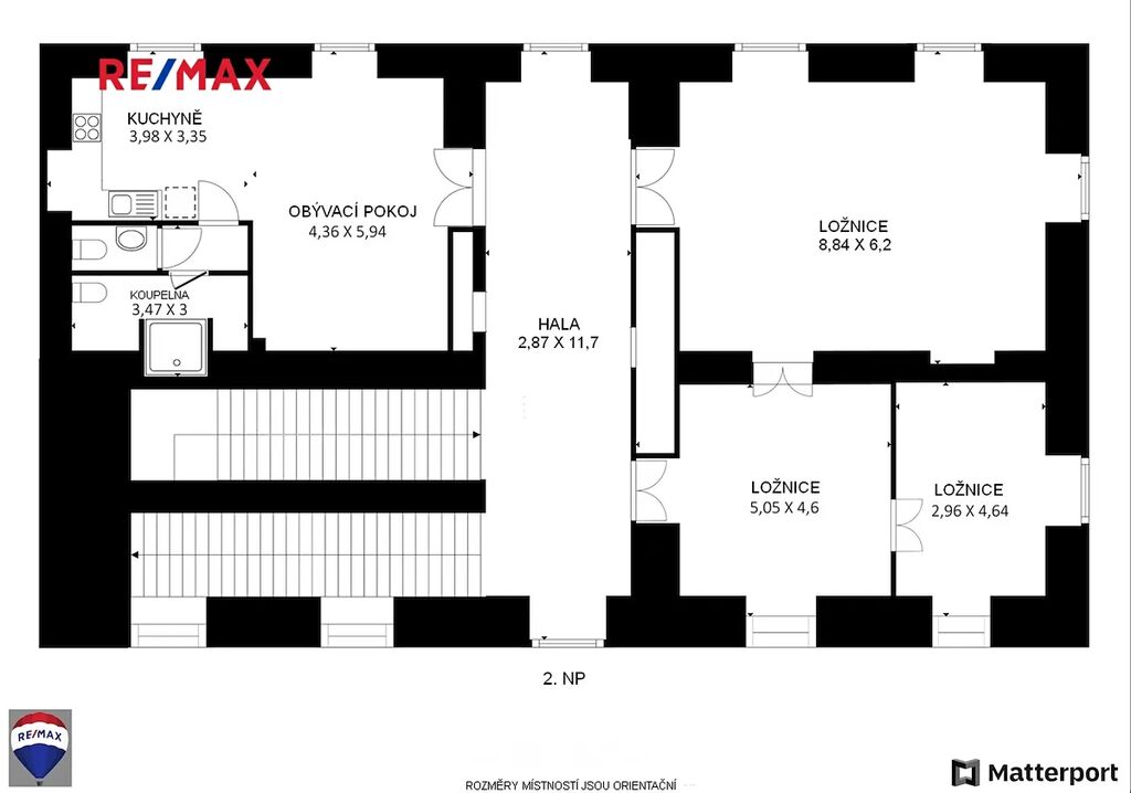 Chodba cca 31,58 m², velká ložnice cca 43,94 m², ložnice cca 14,71 m², ložnice cca 20,23 m², schodiště cca 24,62 m², jídelna s kuchyní a posezením cca 33,85 m², předsíň cca 1,50 m², WC cca 1,39 m², koupelna cca 5,77 m².