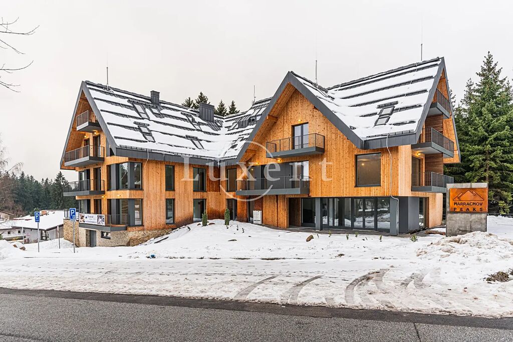 Harrachov Peaks je luxusní projekt vystavěný z kvalitních přírodních materiálů s wellness se saunou a vířivkou a plně vybaveným fitness. Představuje pouze 16 moderních apartmánů a nabízí tak komorní atmosféru v domě pro jejich majitele. Svým konceptem uspokojí zájemce jako o druhé bydlení v Krkonoších, tak investory se záměrem zajistit své finance nebo praktikovat výnosové krátkodobé pronájmy. Součástí nabídky je i správa apartmánů včetně pronájmů. Projekt HARRACHOV PEAKS nabízí vysoký standard vybavení – dubové podlahy, dřevěné terasy, velkoformátové obklady v koupelnách a na chodbách a další. Vytápění probíhá tepelnými čerpadly a je rozvedeno podlahovým topným systémem. V bytě je rekuperace. Energetická třída je velmi úspornou B. Kolaudace úspěšně proběhla a nastěhování je možné ihned.
